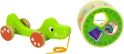A fa krokodil játék válogatóval sok oktató elemet kínál. A nagy kör a válogatóval és a három hátán lévő blokk lehetővé teszi a pontosság gyakorlását, a geometriai formák felismerését, és javítja a koncentrációt és a logikus gondolkodást. A krokodil színes pálcikákkal van felszerelve, amelyek serkentik a gyermek vizuális érzékeit, és a kerekek a zsinórral megkönnyítik a játék mozgatását. A belső blokkok csörgőként működnek, ami felkelti a gyermek kíváncsiságát és serkenti a hallási érzékeit. A krokodil hátán lévő levehető kör többféle játék lehetőségét teszi lehetővé.