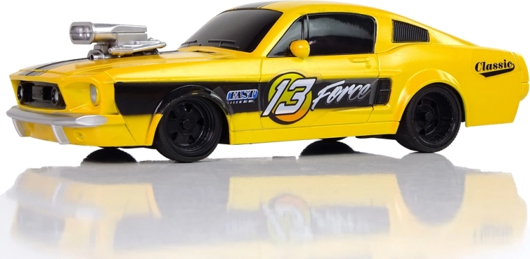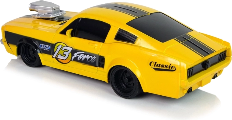 Az autó könnyű és masszív felépítésű, sportos dizájnnal, fekete csíkkal a tetőn, amely karcos, vagány hatást kelt. A gumigumik garantálják az úttartást. A jármű irányítása különösen a legkisebbek számára remek szórakozás, ezért a készlethez tartozó távirányító lehetővé teszi a kis autómodell vezetését, két külön gombbal az előre/hátra és az oldalirányú mozgáshoz.