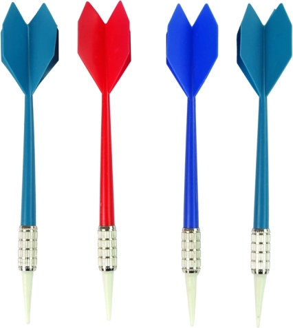 Négy fémes dart különböző színű tollakkal a pontos célzás érdekében.