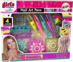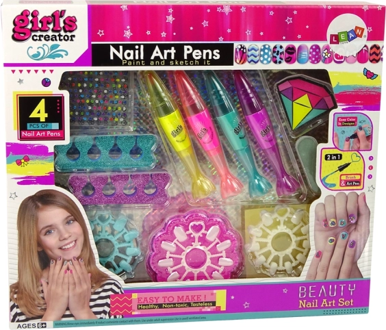 Fejlessze gyermekeinek kreativitását ezzel a körömlakkozó készlettel. A lányok biztonságosan és szórakoztatóan fejleszthetik fantáziájukat és precizitásukat, miközben saját körmeiket díszítik. A készlet különböző dekorációs elemeket tartalmaz, mint például színes matricák és csillámos elválasztók, amelyek eredetiséget és stílust adnak. A lányok gyakorolhatják a díszítést a mellékelt mintákon vagy saját körmeiken.