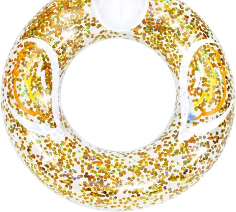 Az átlátszó anyagba zárt arany flitterek a napfényben ragyognak, és növelik a gyermek láthatóságát a vízben.