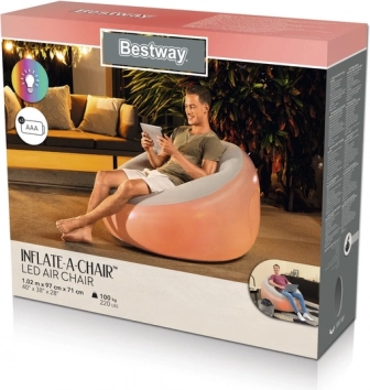 A BESTWAY felfújható fotel 102 × 97 × 71 cm-es méretekkel praktikus megoldás otthonra, kollégiumi szobába és teraszra is. A beépített LED háttérvilágításnak (7 szín) köszönhetően kellemes hangulatot teremt filmnézéshez, játékesthez vagy munkautáni pihenéshez. Leeresztve minimális helyet foglal és könnyen hordozható.