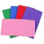 A készlet színes habszivacs négyzeteket tartalmaz öt különböző színben: rózsaszín, lila, kék, piros és zöld.