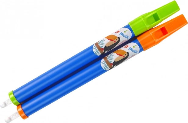 A csomagban két fuvola található, melyeket gyönyörű színek és természetes motívumok díszítenek. Gyerekjáték, ami szórakozást és kreatív lehetőséget kínál a zenei hangokkal történő játék során.