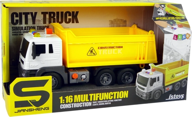 Valósághű építkezési billenőplatós teherautó 1:16 méretarányban, amely örömet szerez a kis építőknek. Emelhető platóval a könnyű rakodáshoz és ürítéshez, fény- és hangeffektekkel a még nagyobb mókáért, valamint lendkerekes meghajtással a sima haladáshoz. Tartós műanyagból készült, otthonra és kültérre egyaránt alkalmas.