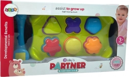 A felső panelen lévő hat forma és élénk színek támogatják a színek és formák megkülönböztetését, és fenntartják a gyermek figyelmét.