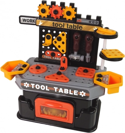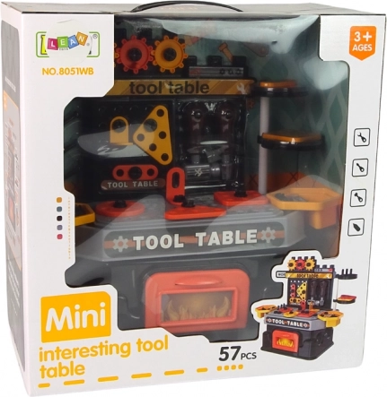 Kreatív barkácskészlet kis ezermestereknek, összesen 57 darabbal, amely órákon át tartó szórakozást és tanulást nyújt. Tartalmaz egy munkapadot akasztható fali panellel, tárolódobozokkal, satuval, mozgó fogaskerekekkel és bőséges szerszámkészlettel. Fejleszti a finommotorikát, a koordinációt, valamint a formák és színek megkülönböztetését.