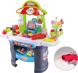 A kézi szkenner az áruk beolvasásakor pittyenő hangot és piros fényt ad ki, ezzel téve a játékot még életszerűbbé. A szett tartalmaz pénztárgépet, bankjegyeket és érméket, édességpultot, fagylaltot, nyalókákat, zöldségeket (sárgarépa, padlizsán, kukorica), gyümölcsöket (szőlő, banán, citrom, alma, körte, narancs), tojást, karton csomagolásokat, műanyag csomagolásokat (tej, konzerv gyümölcs), konzerveket, polcokat és kosárkákat. A minőségi kivitelezés és a tanúsított anyagok biztonságos játékot biztosítanak 3 éves kortól.