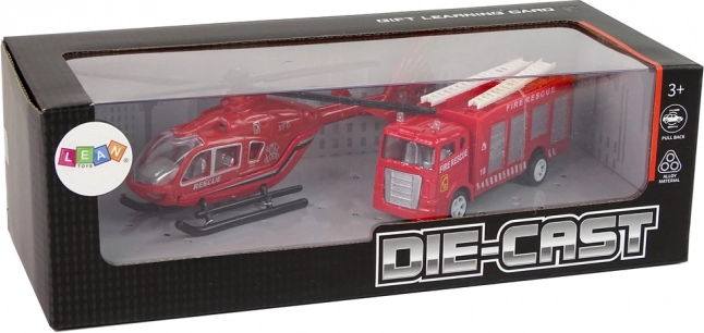 A csomagban található egy tűzoltóautó, helikopter és 6 kártya különböző járművekkel. Nagyszerű szórakozás 3 éves kortól, a játék megfelel az EN71-es szabványnak.