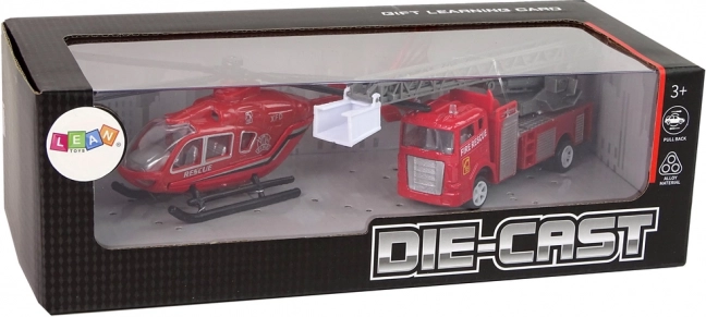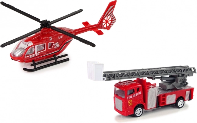A készlet két tűzoltóautót és egy helikoptert tartalmaz hat különféle jármű kártyával. A játékok méretei lehetővé teszik a könnyű kezelhetőséget még a legkisebb kezek számára is.