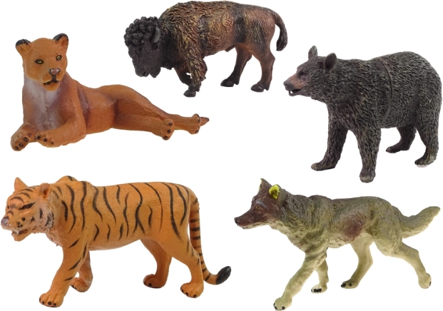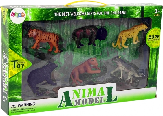 A készlet 6 figurát tartalmaz: medve, farkas, jaguár, tigris, bölény, oroszlán. A figurák magassága: 10 cm x 6 cm x 4 cm. A doboz méretei: 45 cm x 27 cm x 7 cm.
