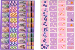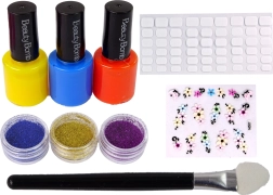 Díszítse körmeit különböző mintás matricákkal és szórt csillámokkal három ragyogó színben.