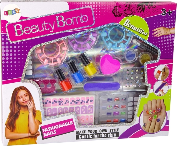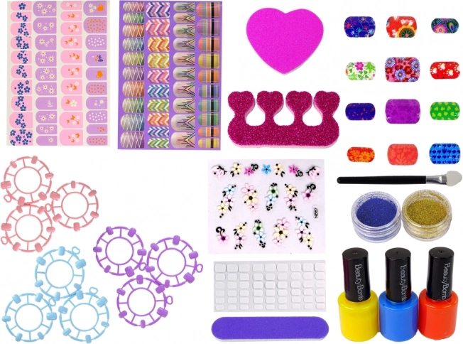Ez a készlet több színes körömlakkot és különféle színű matricákat tartalmaz. Klasszikus, mintás és csillogó lakkok lehetővé teszik a körmök gyönyörű festését, melyeket könnyű és egyszerű eltávolítani szokásos körömlakklemosóval.< /p>