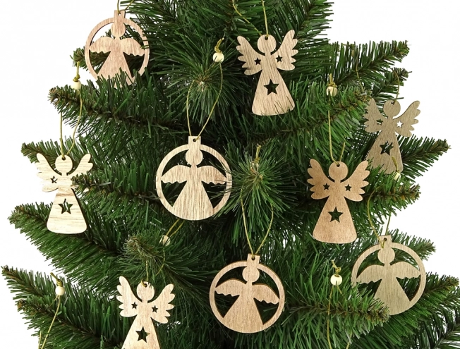 Elegáns 12 darabos, fából készült angyalkaszett a karácsonyfa díszítéséhez. Természetes megjelenés, finom kidolgozás és akasztózsinór a hagyományos karácsony kedvelőinek örömére. A díszek könnyűek és tartósak, gyermekes háztartásokba is alkalmasak (3 éves kortól).