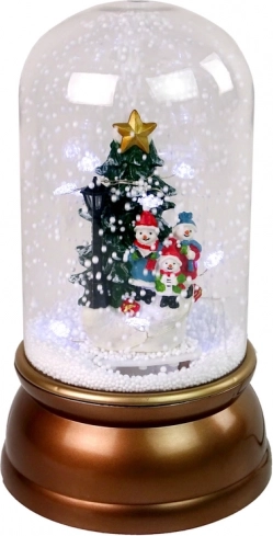 Stílusos üveg karácsonyi gömb vidám hóembercsalád jelenettel a fenyőfa mellett, amely egyedi ünnepi hangulatot ad otthonodnak. A belső pumpa a talapzatból keringeti a havat és felülről porlasztja, valósághű hóesés effektust hozva létre. A dekoráció kellemes, meleg fehér fénnyel világít, megteremtve a meghitt téli atmoszférát.