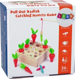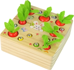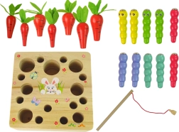 A csomag tartalmaz egy lyukakkal ellátott fa alapot, 6 répát, 6 kukacot és egy mágneses horgászbotot. Minden répa más méretű, és a megfelelő nyílásba illik, ami támogatja a válogatást és a finommotorikát. A bot végén lévő mágnes segítségével a kukacok könnyedén „kihalászhatók” – véletlenszerűen vagy szín szerint, ami a játékhoz együttműködést, koncentrációt és kertészkedős szerepjátékot ad hozzá.