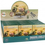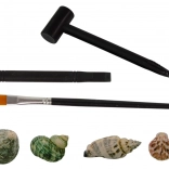 A csomag része biztonságos eszközök együttese a kis régészeknek: véső, kalapács és ecset. A gyerekek gyakorolják a pontosságot, türelmet és kézügyességet, és fokozatosan létrehozhatják saját kagylógyűjteményüket. A dobozon megtalálhatók a lehetséges modellek képei (pl. fésűkagyló, zöld csiga, turridae, fekete szájadékú csiga, piros színű csiga), így a beazonosítás egyszerű.