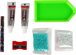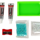 A csomag tartalma: rénszarvas medál (magasság kb. 7 cm), 2 csomag színes kristály, kristálytálca, 2× tubus ragasztó, viasz toll és hegyező.