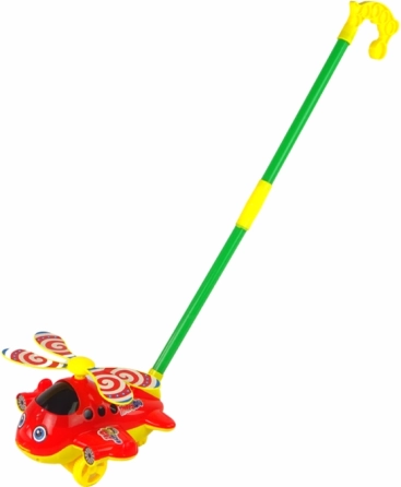 A helikopternek forgó rotorjai vannak, amelyek csengetős hangokat adnak, és mozgáskor játékos elemek csúsznak ki az elejéről. A csatolt bot könnyű tolást tesz lehetővé.