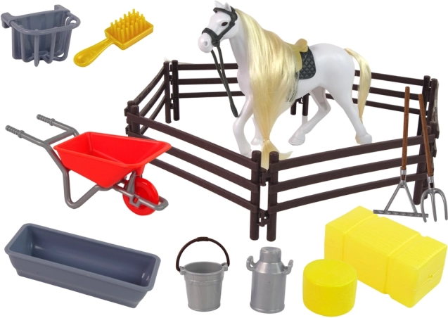 Ez a varázslatos lófigura hosszú sörénnyel ideális fésülködésre és fonatok készítésére. A készlet tartalmazza az istállóbeli mindennapi élethez szükséges kiegészítőket is - mint például talicska, gereblye, villa vagy vizes és etető vödörek. A gyerekek órákon át szórakozhatnak új állati barátjuk gondozásával, miközben fejlesztik kreativitásukat és kézügyességüket.