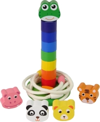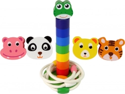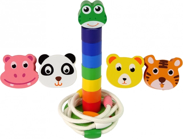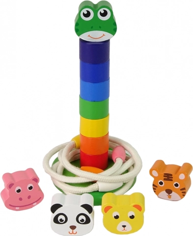 Ez a fa oktatójáték két népszerű tevékenységet egyesít: színes torony építését aranyos békafejjel vagy más állatfejjel, valamint kötélgyűrűk dobását a rúdra. A telt színű elemek természetes módon ösztönzik a gyerekeket a válogatásra, számolásra és felfedezésre, miközben a masszív fa szerkezet hosszú élettartamot biztosít.