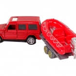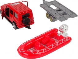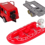 Felfújható csónak utánfutóval, ideális vizes mentőakciókhoz, csatlakoztatható az autóhoz.
