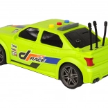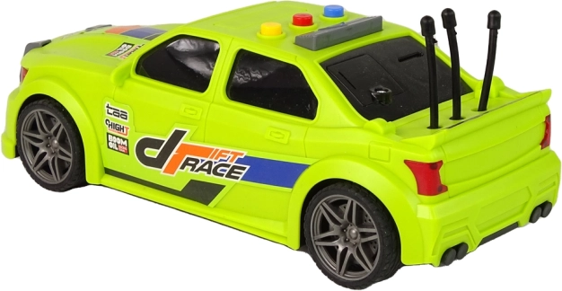 A neonzöld karosszéria a „Drift Race” feliratú, látványos matricákkal, sportfelnik és alacsony profil autentikus, versenyautós megjelenést adnak, ami azonnal magával ragadja a gyerekeket.