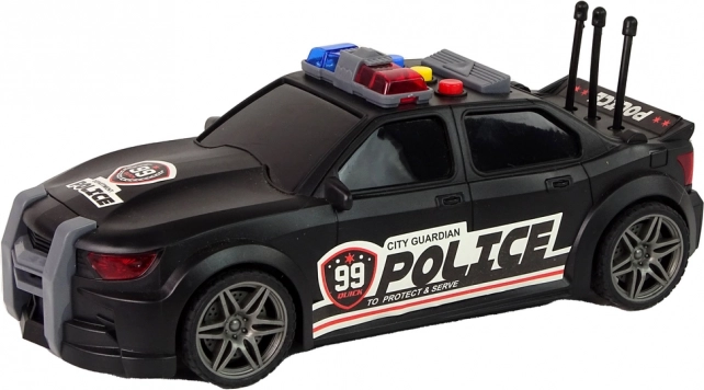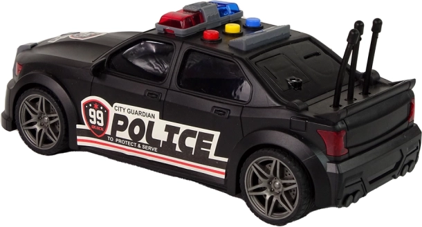 Fekete sportos kivitel POLICE feliratokkal, kék-piros villogókkal és antennákkal, amely valósághű megjelenést kölcsönöz a játéknak.