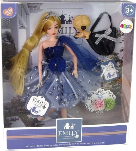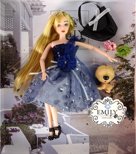 A bájos Emily baba csillogó, kék, tüll átfedésű ruhájával minden kis divatrajongót elvarázsol. A szettben találsz egy kutyust, egy elegáns, ezüst masnis kézitáskát és két virágot a kreatív díszítéshez. A babának mozgatható végtagjai vannak az egyszerű pózoláshoz, és tökéletes a fantáziadús játékhoz és divatbemutatókhoz.