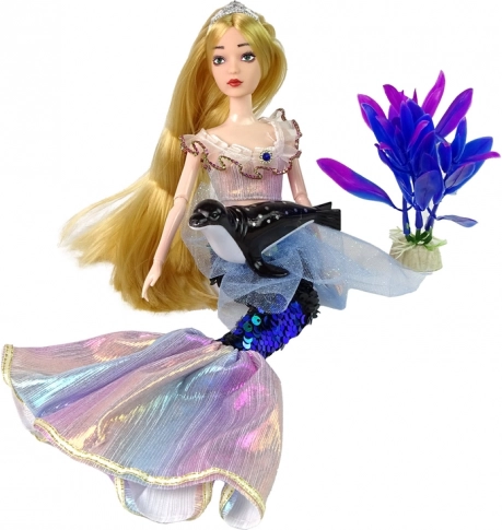 Fedezd fel a varázslatos világot a Emily tengeri sellő babával! Hosszú szőke haja van, csillogó tiarája és kétoldalas flitteres farka zöld‑lila árnyalatokban, amely érintésre feketére vált. A farkat le lehet venni, így a gyerekek klasszikus babaként is játszhatnak vele. Aranyos kiegészítők is járnak hozzá – fekete‑fehér fóka figura és akváriumi növény még fantáziadúsabb történetekhez.