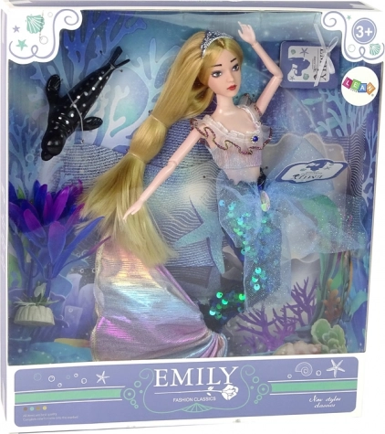Emily baba rengeteg alkotó játékot kínál. Csillogó, színt váltó flitteres farka első pillantásra elbűvöl, elegáns fodros topja pedig kiemeli sellő stílusát. A farok levétele után megáll a lábán, és készen áll a víz alatti királyságon túli kalandokra is.