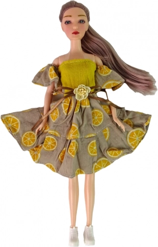 Emily babának hosszú haja, gyönyörű citrusmintás ruhája és fehér cipőcskéi vannak. Az ízületes végtagok természetes pózokat tesznek lehetővé.