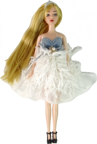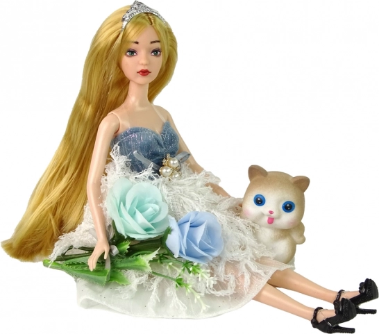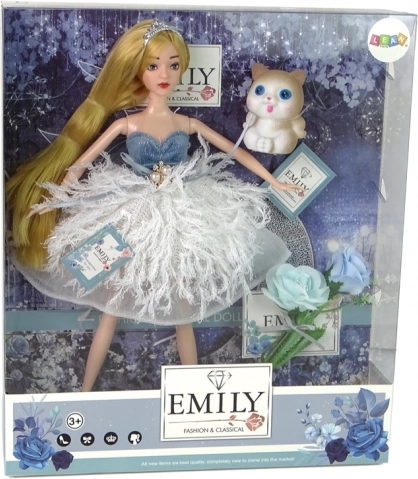 Elbűvölő EMILY baba elegáns fehér–kék, csillogó, tollhatású ruhában, amely örömet szerez a kis divatrajongóknak. A szett aranyos kiscicát és dekoratív virágokat tartalmaz. A babának hosszú szőke haja van tiarával, feltűnő kék szemei és stílusos cipői. Remek ajándék, amely támogatja a kreatív játékot és a történetmesélést.