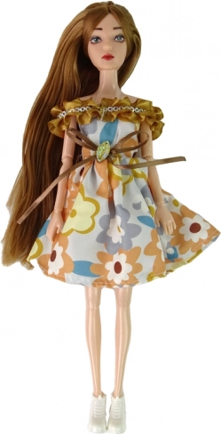 Fedezd fel az ősz varázsát Emily babával – stílusos társként a mindennapi játékhoz és kiállításhoz. A hosszú, barna haj fonások és frizurák tanulására csábít, a finom, masnis és csillogó díszköves virágmintás ruha bájt kölcsönöz a babának. A bézs virágos kalap gyönyörűen teljessé teszi az összeállítást.