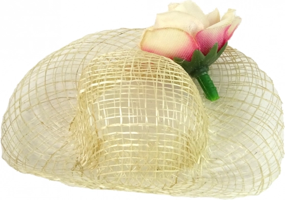 A virággal díszített bézs kalap szépen kiegészíti a masnis, díszköves virágmintás ruhát – tökéletes megjelenés minden alkalomra.