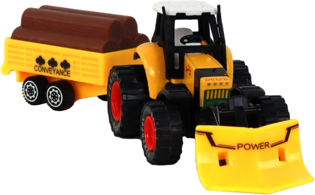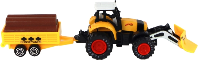 A traktor dörzshajtással van felszerelve, amely lehetővé teszi a traktor mozgásának könnyű irányítását. A gyerekek farmot játszhatnak, és különböző anyagokat szállíthatnak az utánfutón, amely fák törzsének utánzataival van felszerelve.