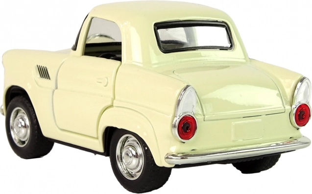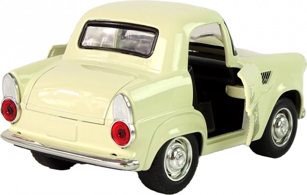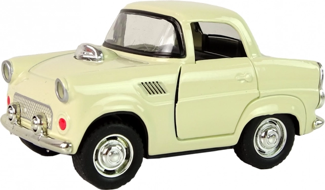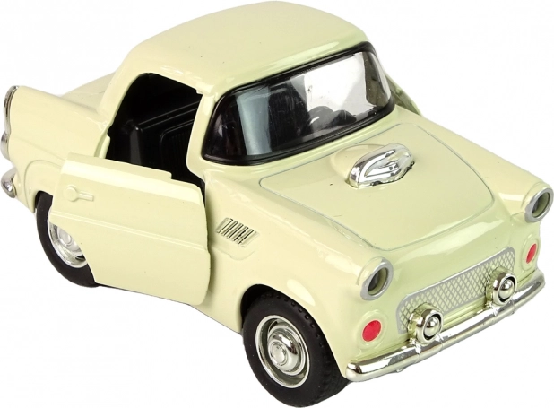 Klasszikus fém autó bézs színben, fekete és ezüst részletekkel a valósághű megjelenésért.
