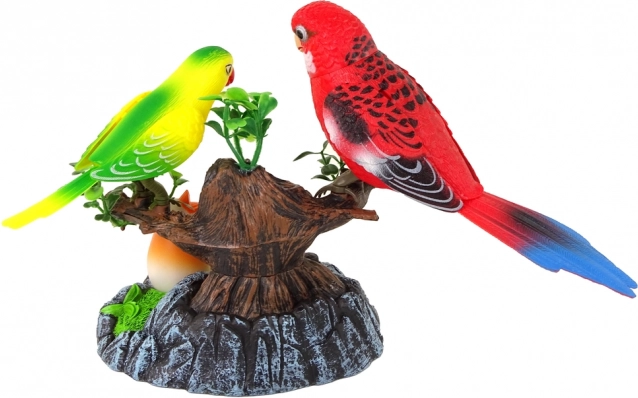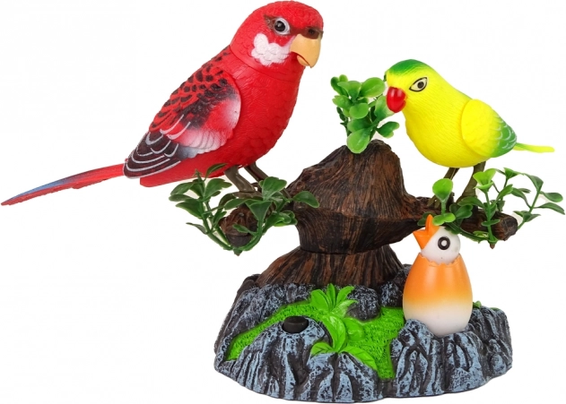 A csomagolásban két papagájt talál – pirosat és sárgát – egy faágon ülve, valamint egy kis fiókát a tojáshéjban. A faágon lévő madarak különféle hangokat adnak ki és mozognak, lehetővé téve, hogy úgy érezze magát, mintha a természet ölében lenne, miközben a madár színes fényt sugároz. Csak nyomja meg a fekete gombot, hogy aktiválja a játékot.