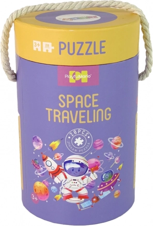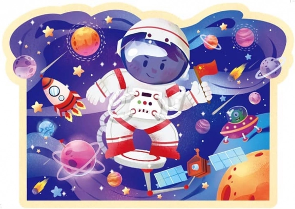 Az illusztrációk tartalmazzák egy kis űrhajós figuráját a bolygókkal, rakétákkal és műholdakkal teli környezetben, amelyek bevonják a gyermeket egy színes és részletes űrbeli kalandba. A kényelmes kör alakú csomagolás lehetővé teszi az egyszerű szállítást és tárolást, ideális otthoni használatra és utazás közben is.