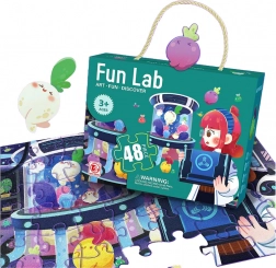 Szórakoztató gyerek kirakó állatos laboratórium témával, 48 darabbal, amely fejleszti a képzelőerőt, a türelmet és a finommotorikát. Az elemek nagyok (kb. 9 x 7 cm), és könnyen illeszkednek; a kész kép mérete 50 x 34 cm. Minőségi kivitel többszöri használathoz, 3 éves kortól ajánlott, megfelel az EN 71 szabványnak.
