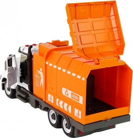 Az oldalsó emelőmechanizmus lehetővé teszi a valódi szemétszállítás szimulálását – a gyerekek csatlakoztathatják a kukát, és tartalmát a felépítménybe billenthetik.