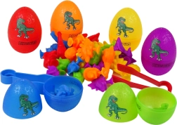 A szett hat színes tojást tartalmaz, amelyekben vidám, tapadókorongos dínófigurák rejtőznek. A gyerekek kinyithatják a tojásokat, felfedezhetik a kincseket, és színek vagy fajták szerint válogathatják a kis dínókat. A figurák a tapadókorongoknak köszönhetően különböző felületekre rögzíthetők, ami gazdagítja és bővíti a játék lehetőségeit, valamint fejleszti a gyerekek kreativitását.