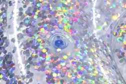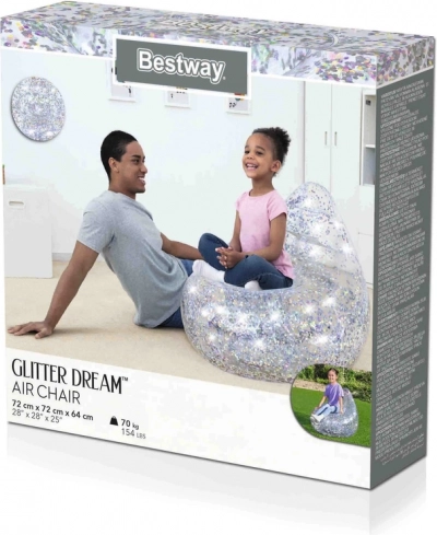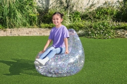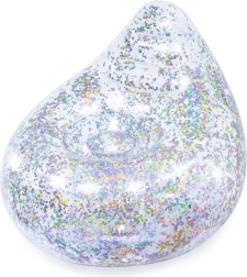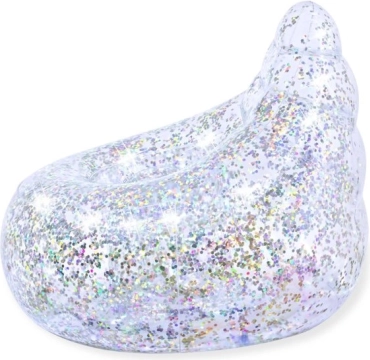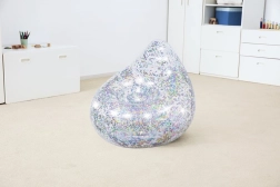 A felfújható fotel átlátszó műanyagból készül, amelyet színes csillámok töltenek meg; minden mozdulatra megcsillannak, extra lendületet adva a térnek.