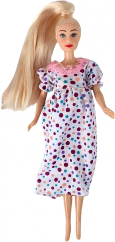 Lucy baba gyönyörűen kidolgozott játék hosszú, fényes szőke hajjal, amelyet lehet formázni és fésülni. Finoman festett arcával a baba valósághű megjelenést nyújt, amely még varázslatosabbá teszi. Fehér, színes pöttyös várandós ruhába van öltöztetve.