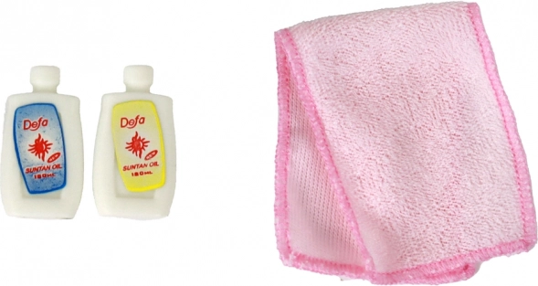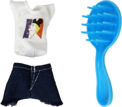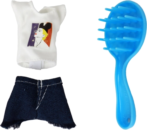 Mintás póló, farmer szoknya, rózsaszín törölköző és mini flakonok a kozmetikai játékhoz – minden egy helyen a változatos történetekhez.