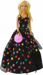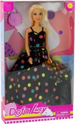 A bájos DEFA LUCY baba hosszú szőke hajával, színes pöttyökkel díszített fekete ruhájával és stílusos kiegészítőivel hívja fel magára a figyelmet. A csomagban rózsaszín kézitáskát, piros cipőcskéket és egy karkötőt találsz. Ideális 3 éves kortól, remek játékhoz és a gyerekszoba díszének is.