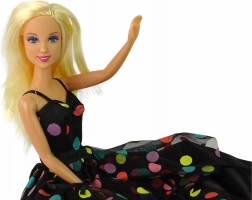 A DEFA LUCY baba elegáns stílust és finom részleteket kínál, amelyek minden kis divatrajongót elbűvölnek. Hosszú, enyhén hullámos szőke haja, a színes pöttyökkel díszített hosszú fekete ruha és az összeillő kiegészítők harmonikus, játékos megjelenést teremtenek. Visszafogott, kékes-rózsaszín szemsminkje és rózsaszín ajkai kiemelik a báját.
