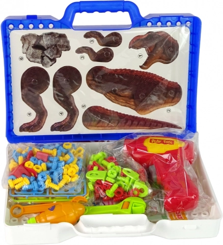- Használati útmutató, hordtáska, 2 lap dinoszaurusz testrészekkel, 8 lap figurákkal, színes műanyag csavarok és kupakok, játék fúrógép, csavarhúzó, 2 csavarkulcs