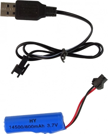 A készlet tartalmaz egy 14500/800 mAh 3,7 V-os akkumulátort és egy USB töltőkábelt, így nem kell külön tápellátást beszerezni a traktorhoz.