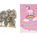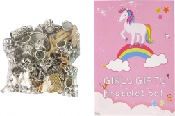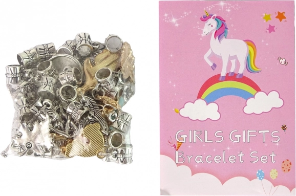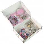 Tartalmaz továbbá 30 színes műanyag gyöngyöt és akár 60 ezüst- és aranyszínű gyöngyöt aranyos állatos, növényes és más gyerekes motívumokkal. Az elegáns csomagolás virágmintás dizájnnal különleges bájt kölcsönöz a készletnek, és ideális ajándék.